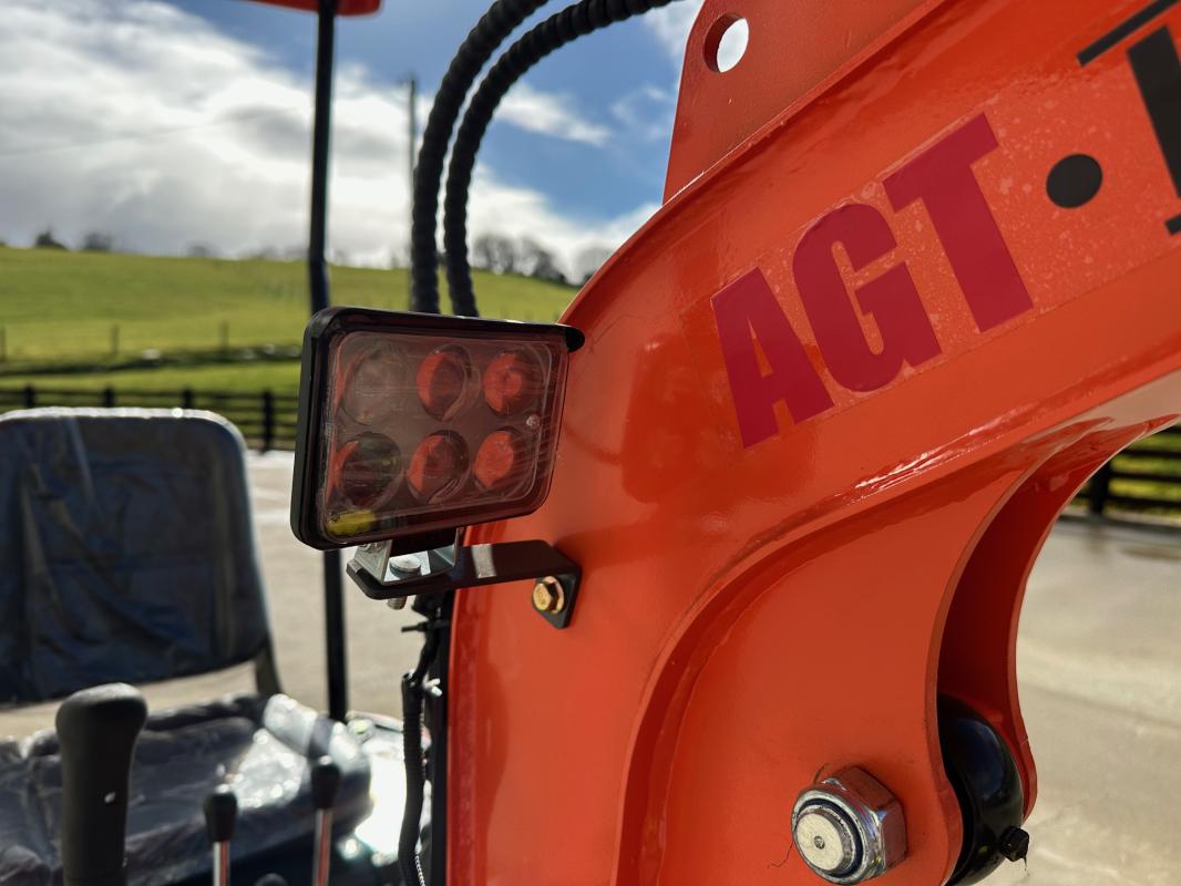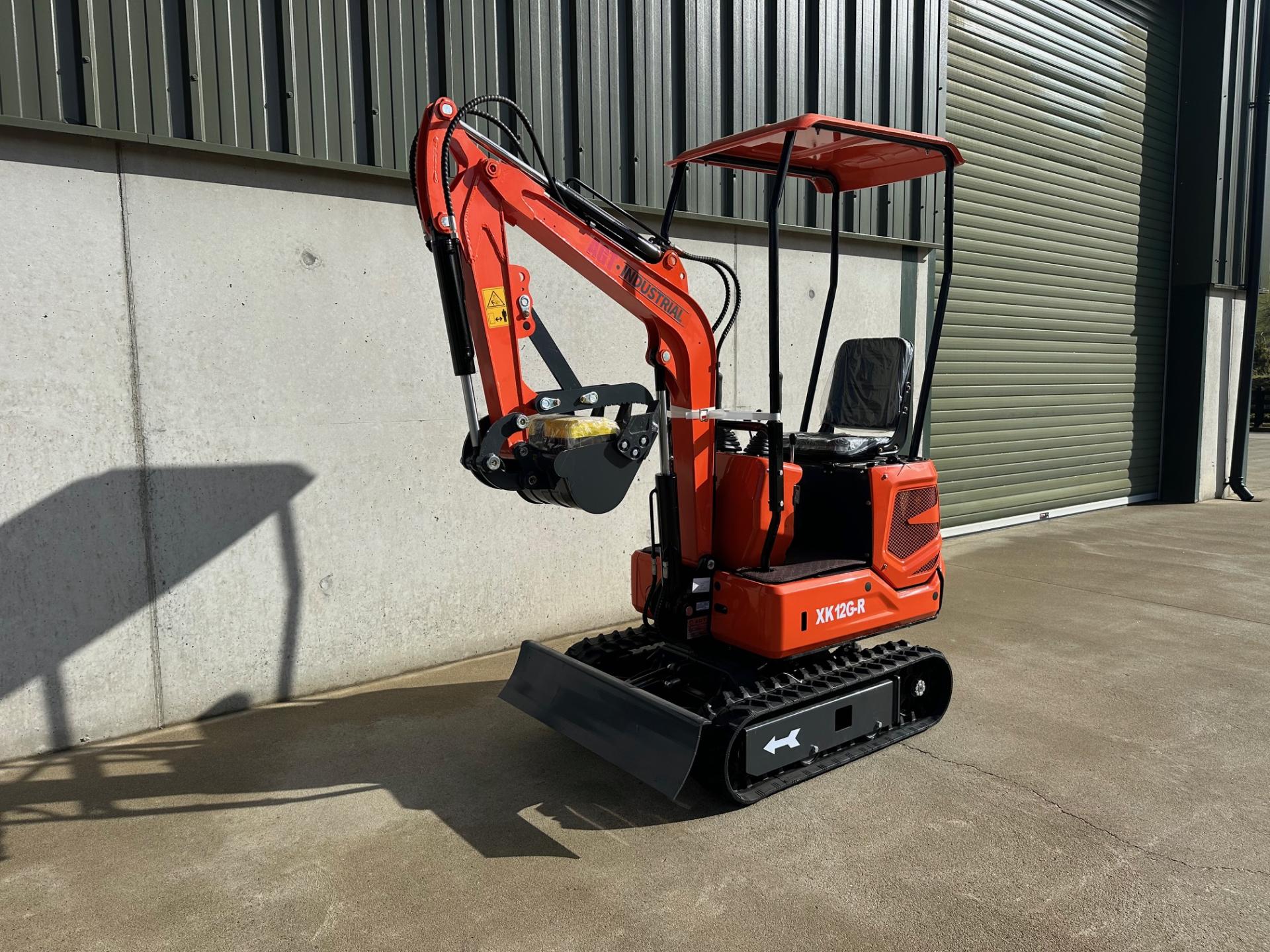 New AGT XK12G-R 1 Tonne Mini Excavator c/w Canopy, 7in Wide Rubber Tracks, Backfill Blade, 16in Digging Bucket, Mechanical Thumb, LED Work-Light and Plumbed for Auxiliary Hydraulics. Also Included is a Toolbox and Maintenance Tools.