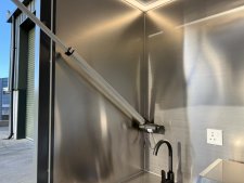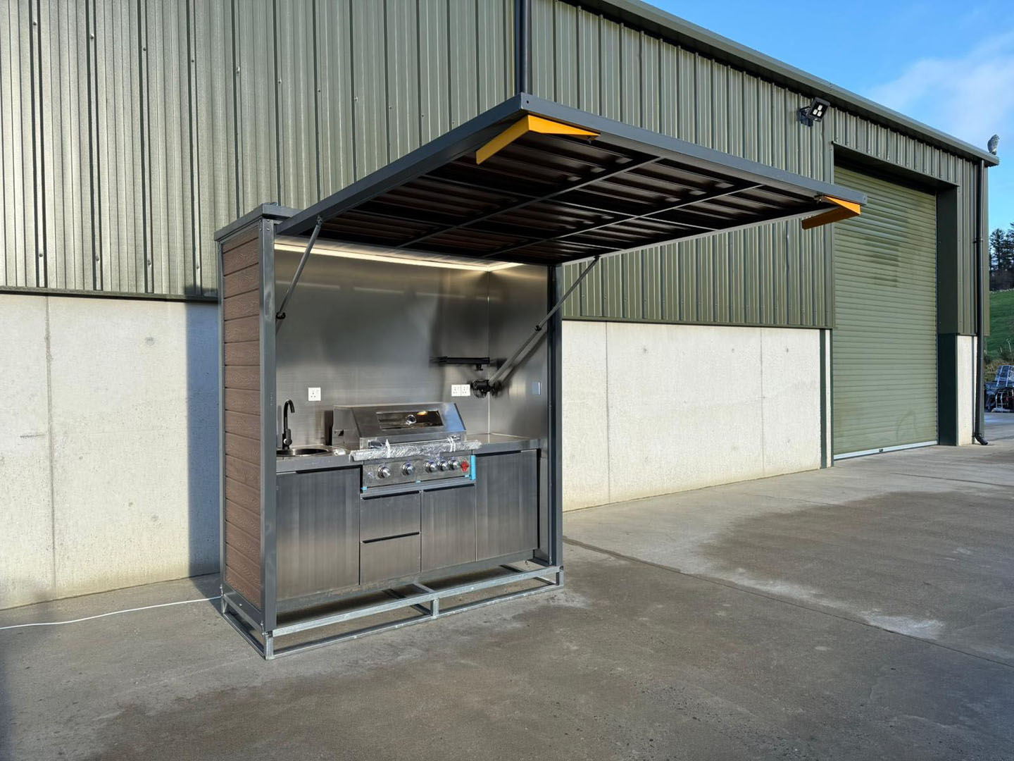 New Outdoor All Year-Round Gas Barbecue Unit c/w Teak Coloured Wood Grain WPC Panels, Grey Powder-Coated Stainless Steel, Barbecue Grill, Hotplate, Under Counter Storage, Sink, Plug Sockets, Bottle Opener, Lights & Electric Door with Remote Control.