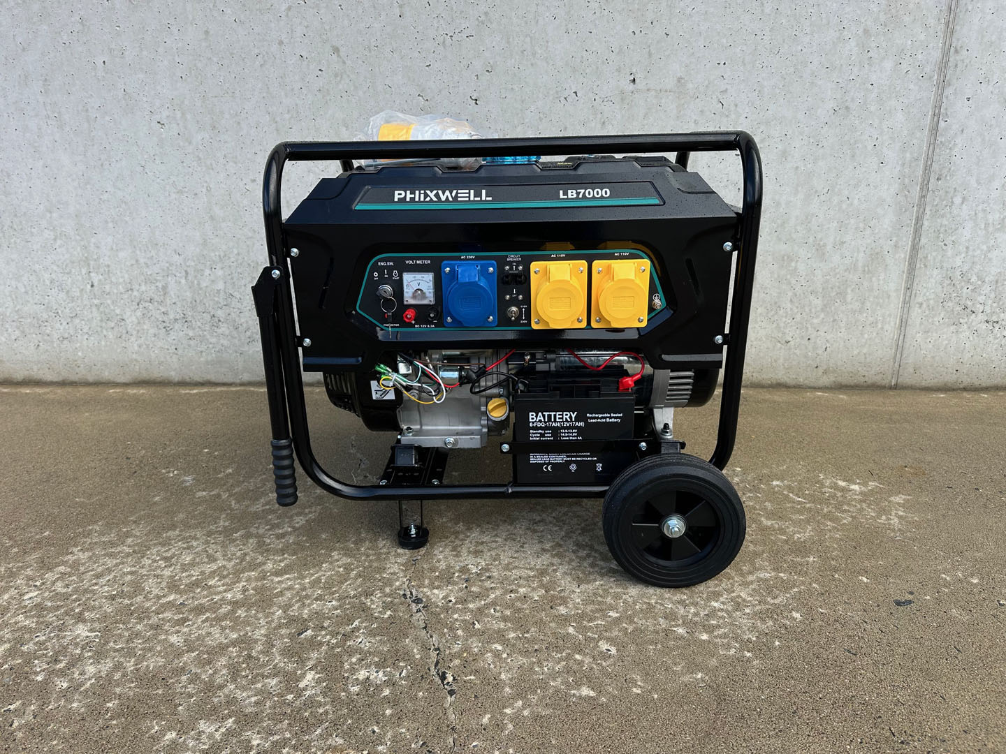 New Phixwell LB7000 Heavy-Duty Portable Petrol Site Generator c/w Operators Manual, Double Ended Spanner, Long Reach Spark Plug Box Wrench, 2 x 32 Amp 110V Plug Sockets and 1 x 32 Amp 230V Plug Socket, 12V Battery Charging Leads Wheel Kit and Handles for Easy Transport.