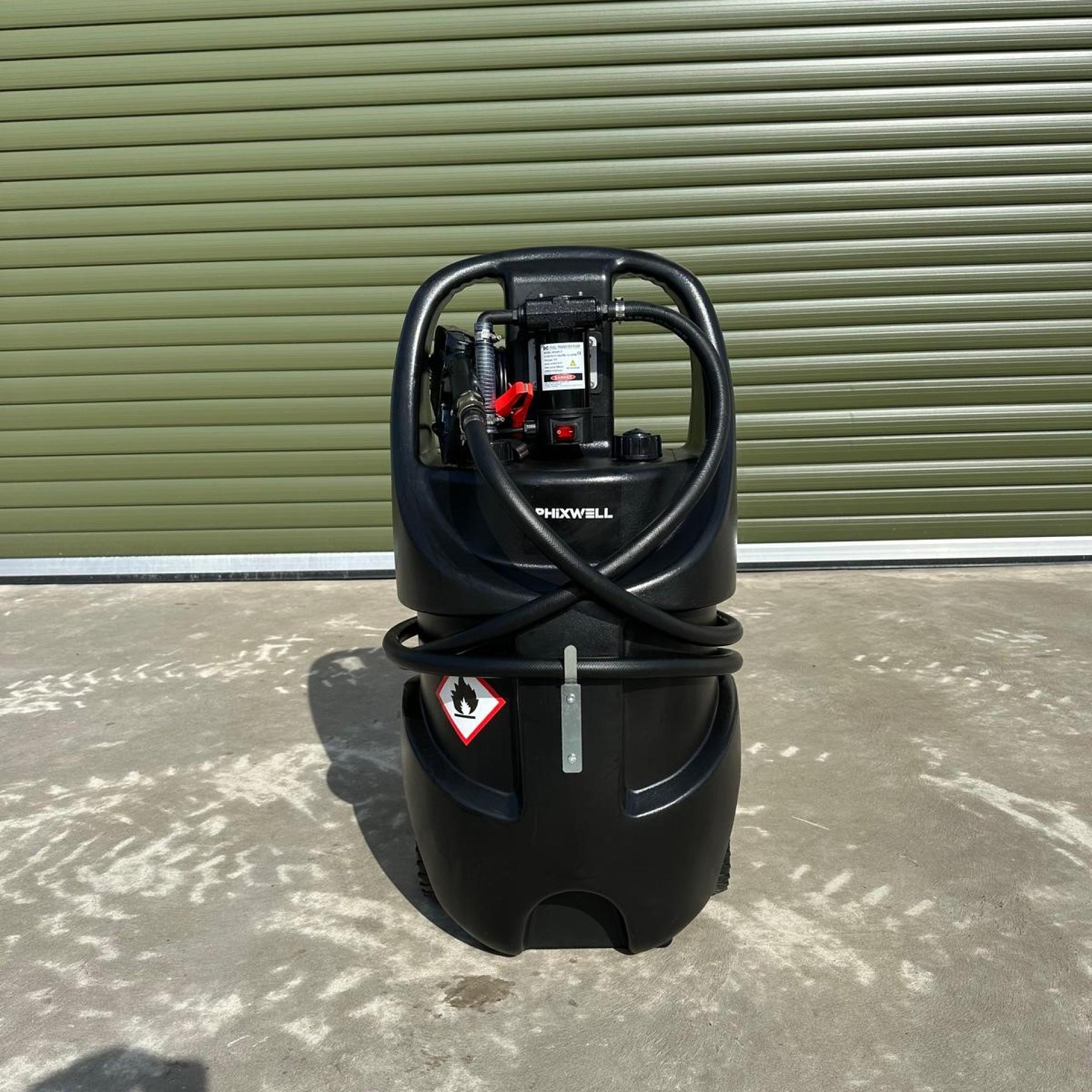 New 75L Portable Diesel Fuel Caddy, High-Density Polyethylene Plastic, 12V Electric Pump (40L/min) , 4m of 3/4" Hose Reel, High-Quality Auto-Shut-Off Fuel Nozzle, 4m Electric Cable with Crocodile Clips, Built-In Lifting Handles and Integrated Wheels.
