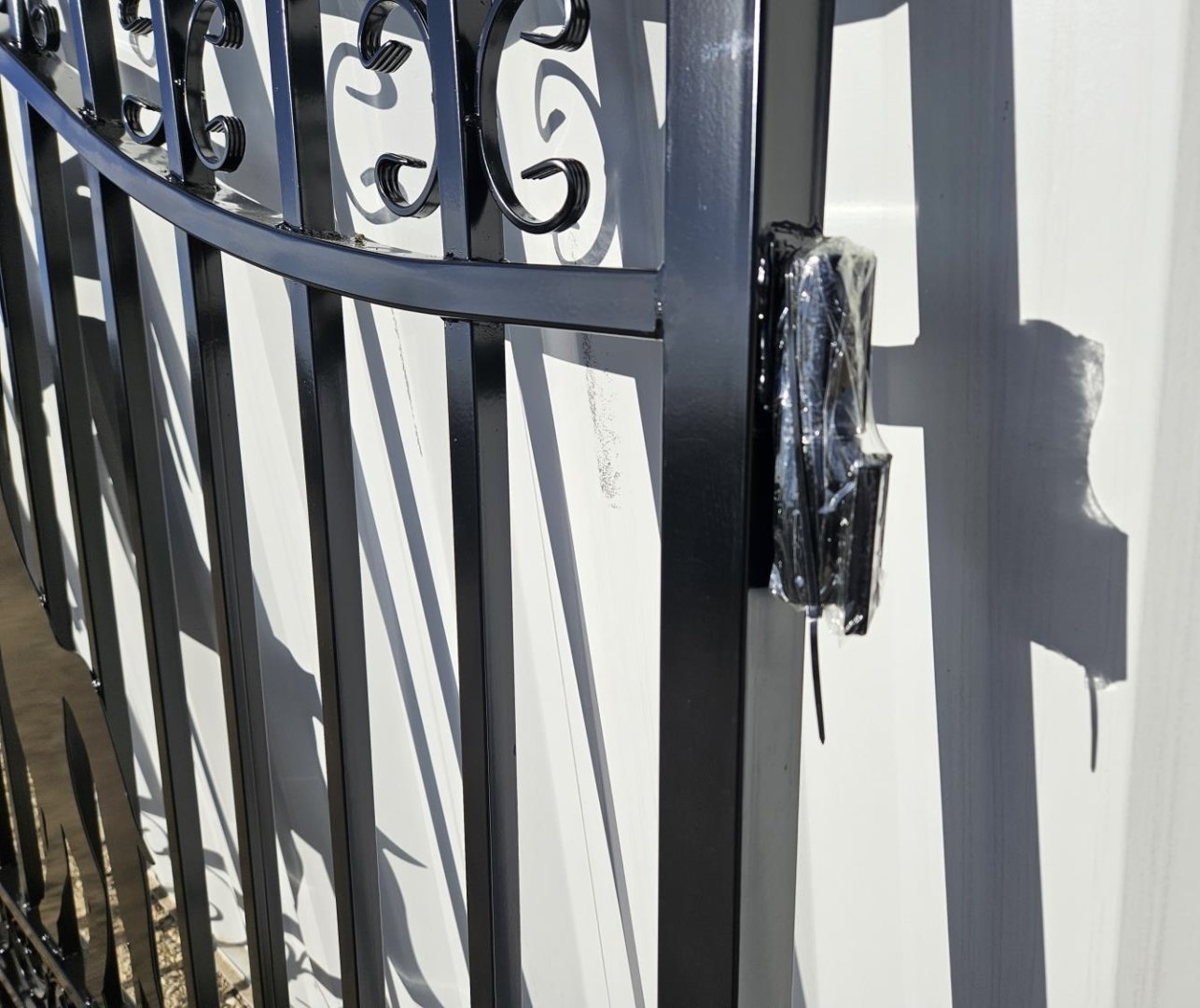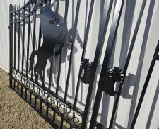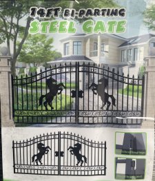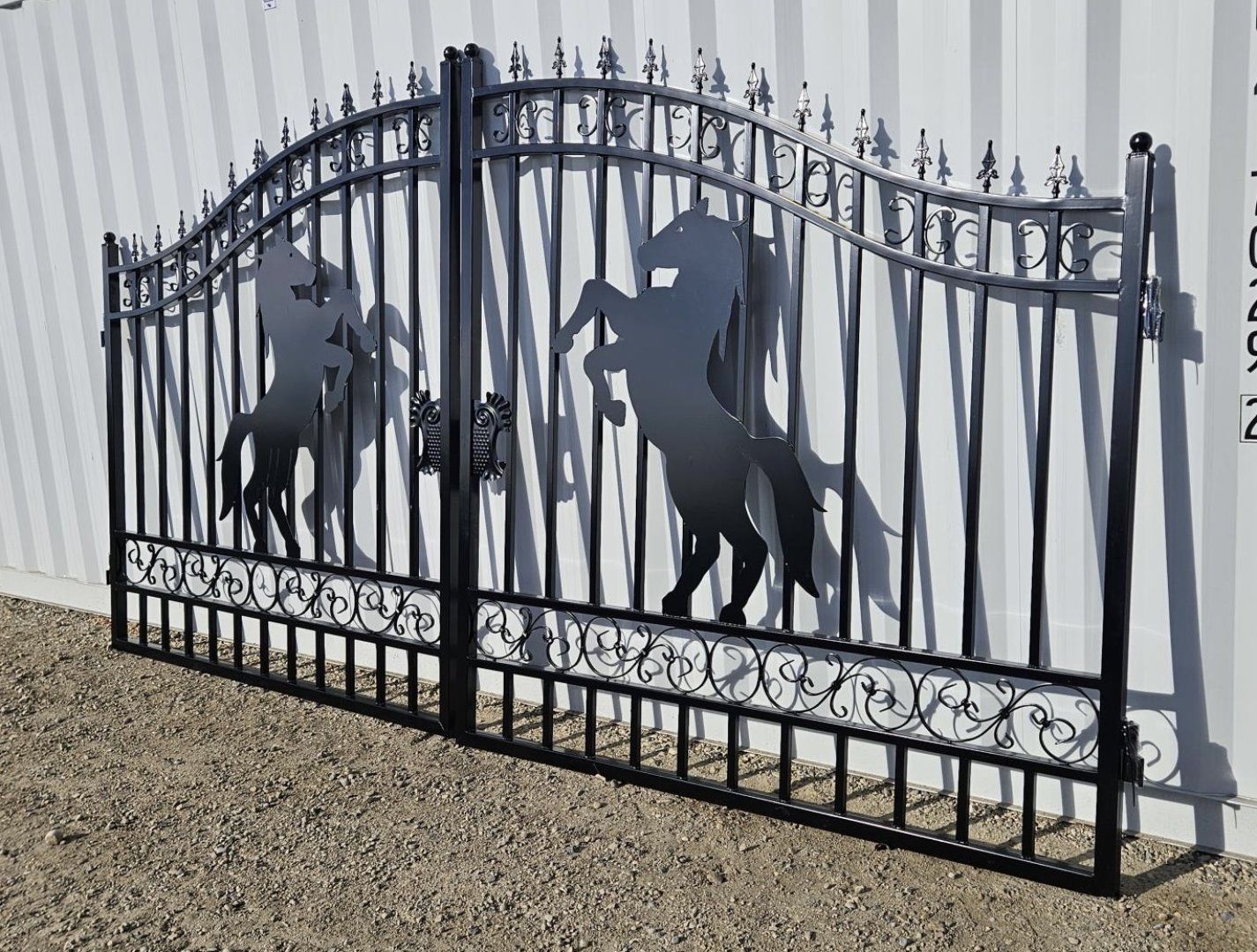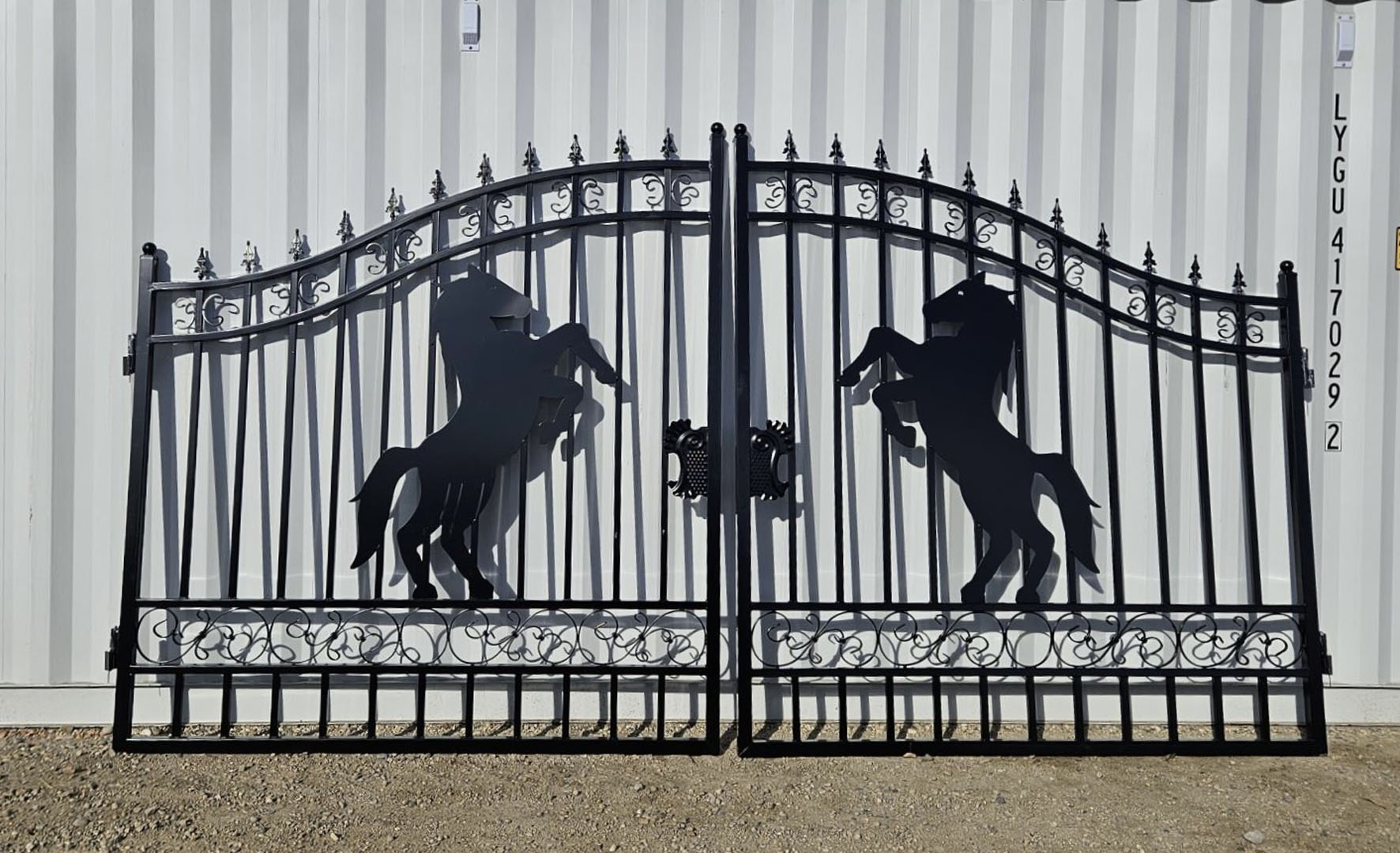 New 14ft Bi-Parting Steel Gates, Double Arc, Matte Black, Hot Dip Galvanised & Powder-Coated (Horse Design)
