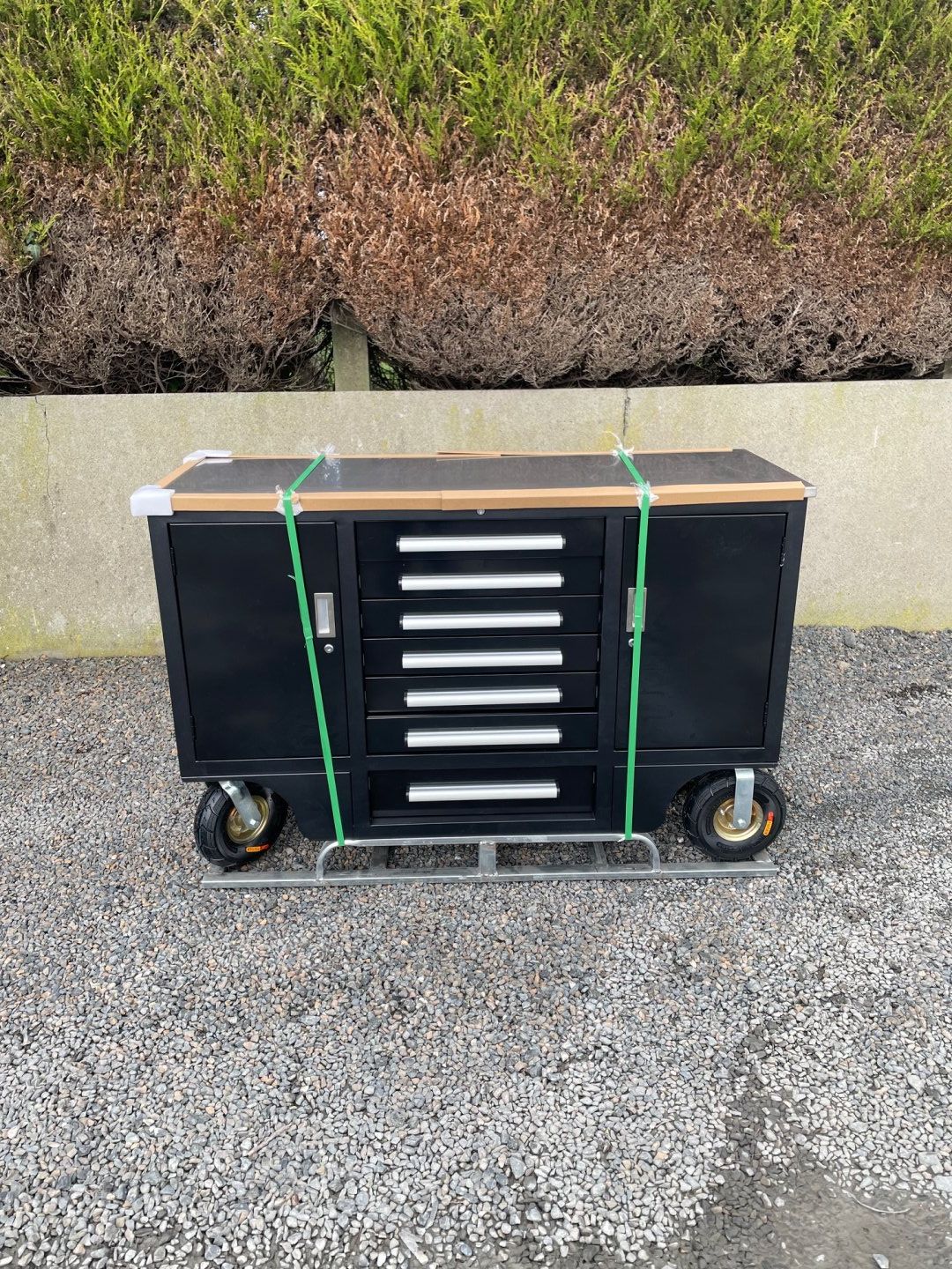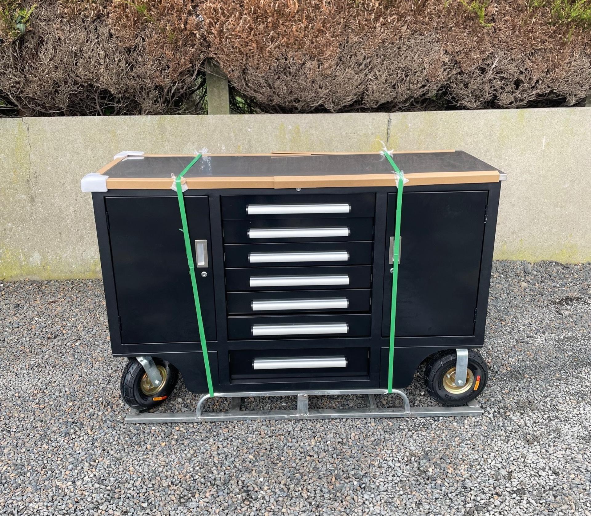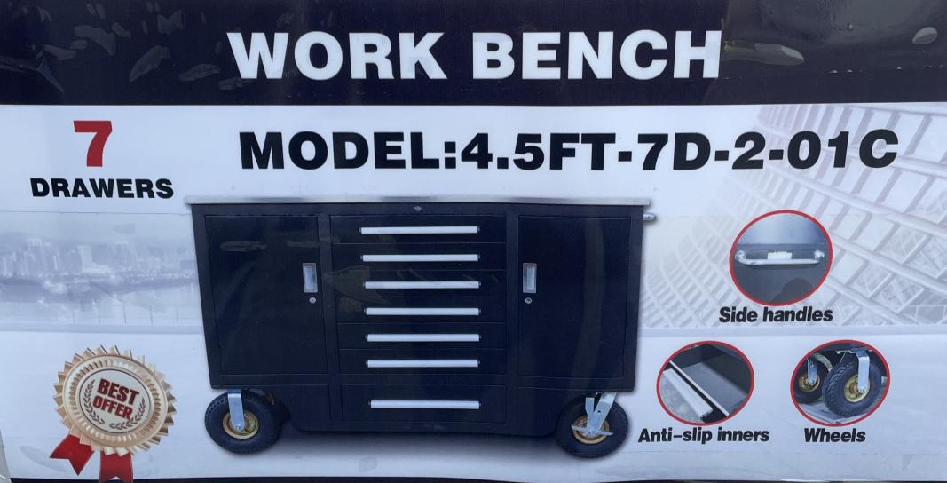 New 4.5ft Workbench with 7 Drawers and 2 Cabinets, Stainless Steel Worktop, Packed in Plastics, Drawers with Lock & Anti-Slip Liners, 3 Section Ball-Bearing Slide Rails, Heavy-Duty Caster Wheels, Stainless Steel, Black Powder-Coated Finish, Lockable Drawers & Cabinets, Stainless Steel Side Handle and c/w Multiple Keys.